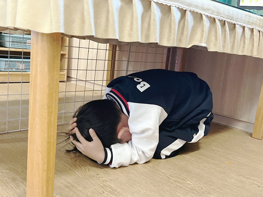 上午9時(shí),“闖關(guān)信號”——急促的地震預(yù)警警報(bào)聲準(zhǔn)時(shí)響起!“地震來啦,快躲到桌子底下!”各班老師立刻化身“闖關(guān)向?qū)А?,引?dǎo)萌娃們雙手抱頭、閉眼低頭,迅速躲到課桌、玩具柜等堅(jiān)固物體下方,緊緊抓住桌腿,避開窗戶和吊燈。