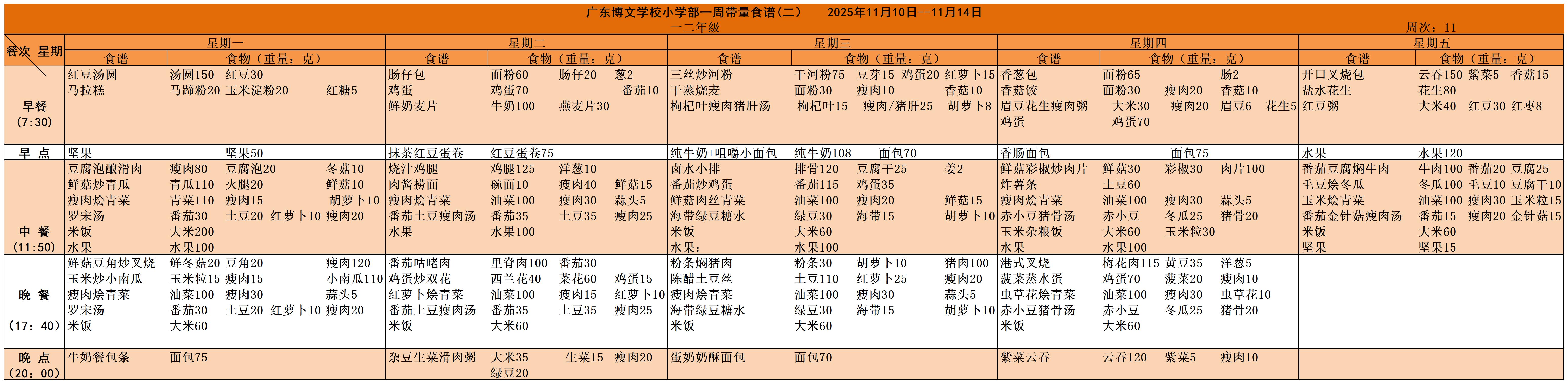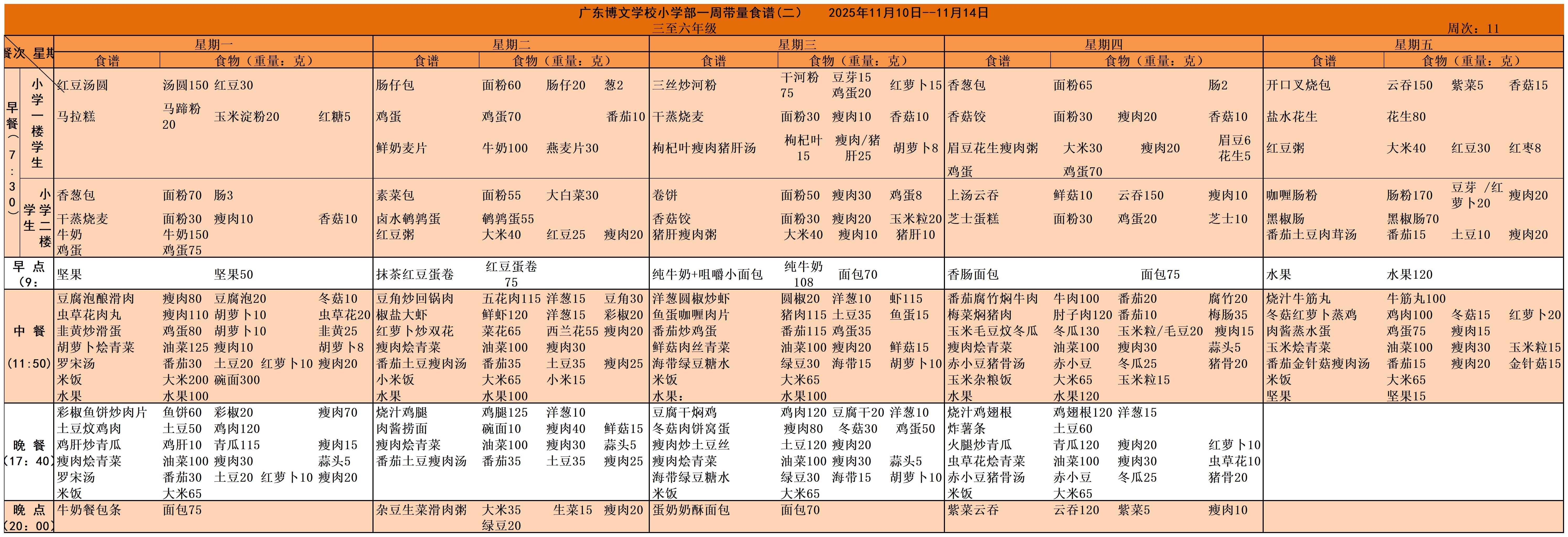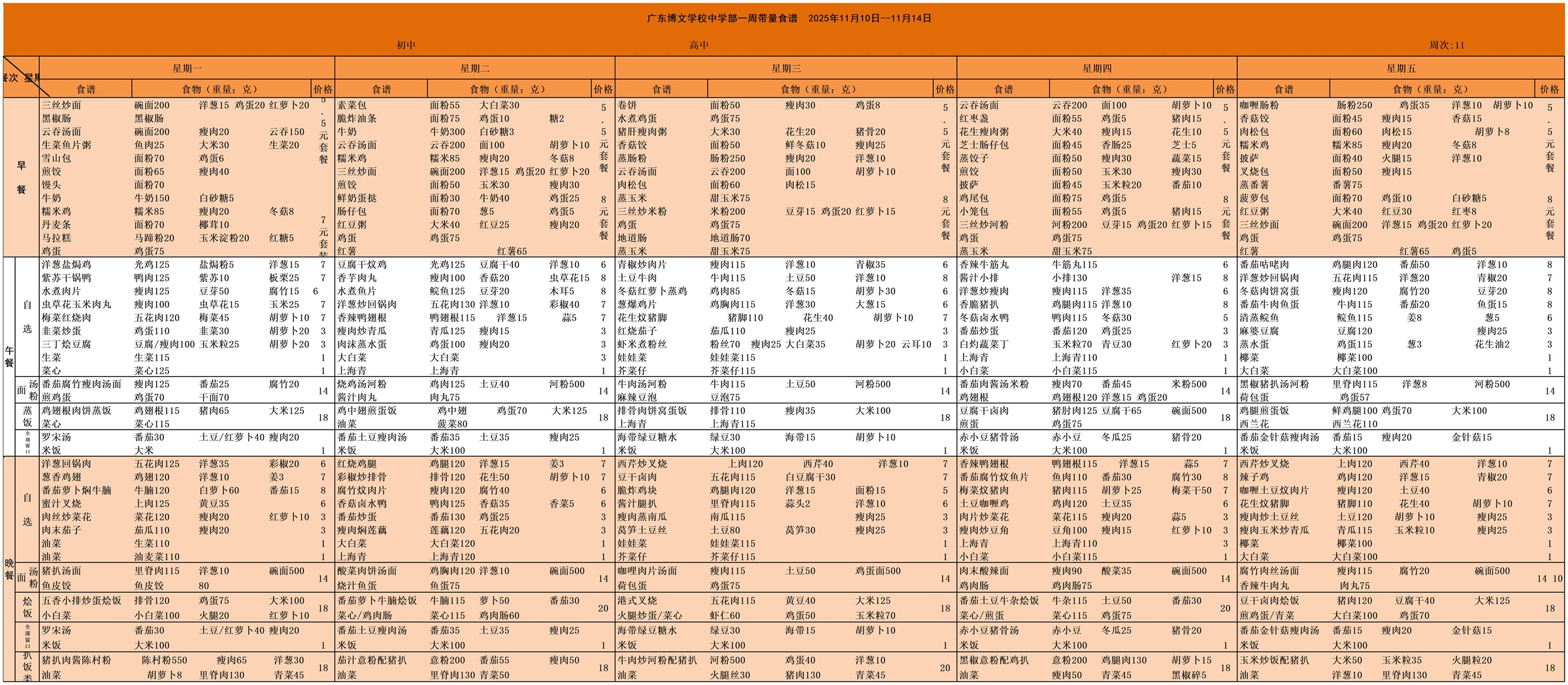 廣東博文學校2025年秋季學期第十一周食譜公示