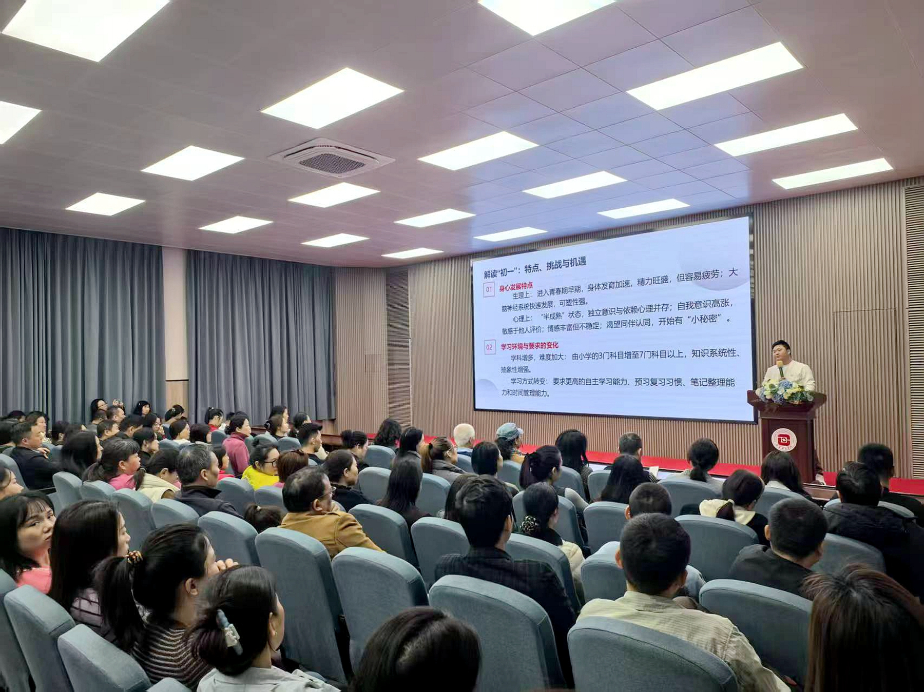 會(huì)議圍繞五大核心議題展開。主講人梁笑老師深入解讀了初一學(xué)生的身心發(fā)展特點(diǎn),指出學(xué)生正處于青春期早期,身心快速發(fā)展,獨(dú)立意識(shí)增強(qiáng),但也面臨情緒波動(dòng)、自我認(rèn)同敏感等問題。在學(xué)習(xí)方面,學(xué)科增多、難度加大,學(xué)習(xí)方式向自主管理轉(zhuǎn)變,這些變化對(duì)學(xué)生和家庭都提出了新的要求。